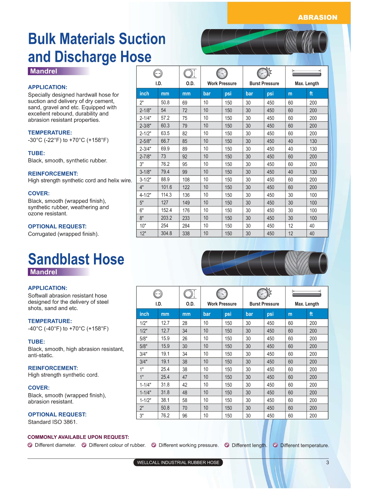 مصممة للتطبيقات الشاقة في السفع الرملي. بفضل بنيتها القوية، تستطيع تحمل الضغوط العالية حتى 15 بار، مما يجعلها مثالية لنقل المواد الكاشطة في البيئات الصناعية. توفر عمليات سفع رملي فعالة لتنظيف وتنعيم أو تشكيل المعادن والأسطح الأخرى. هذه الخراطيم مثالية للاستخدام في الورش ومواقع البناء حيث تتطلب الدقة والقوة.
